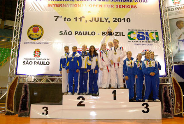 Our alarms woke us at 6.30am on the 9th of July 2010. Both me and my sister were starting to get nervous, as in a few hours we’d be competing on the World Stage. After getting ready and having a light breakfast, we went up to our rooms to collect our kitbags. At 8am we got on the bus which transported us to the stadium. We passed through areas which had really new buildings and areas which were really run down. It seemed that the people who lived in Sao Paulo were either really rich or really poor. We even saw children sleeping under cardboard on street corners. As we walked into the 12,000 seater stadium we were both relishing the prospect of getting to the finals on Sunday. We both went and got changed and made our way to the warm up area where we took the time to get in some last minute practice and get limbered up. At 12.05pm, my (Mitchell’s) section was called, so I proceeded to the area I had been called to. I was one of the last ones to perform in my section so had to wait a while. When I eventually was called up and stepped on the mat, my nerves had completely gone and I performed my Kata to the best of my ability. After finishing and the scores displayed I was in joint 1st place with the Italian. After all the competitors in my section had finished, me and the Italian were still joint first, so I was through to the finals on Sunday!!!